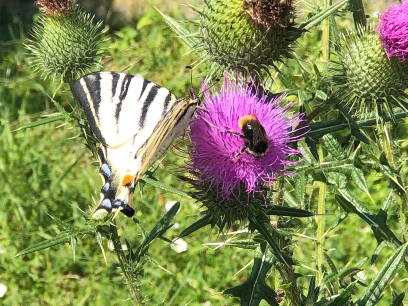 The initial meeting happened while I was waiting for the bus. We didn’t talk as the butterfly was busy with the flower he was sitting on and dealing with the bumblebee who was pollinating the flower.